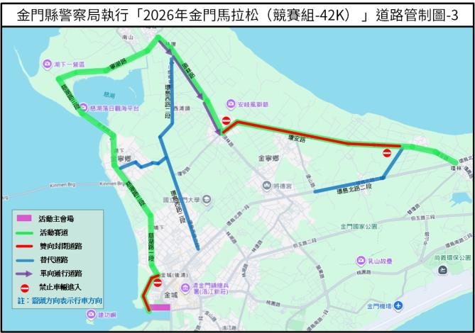「2026金門馬拉松」將於今年1月24、25日登場,賽事共分為兩天舉辦,1月24日健康休閒組於本縣運動發展中心田徑場率先開跑;競賽組則於翌日(1月25日)在行政院金馬聯合服務中心前廣場開跑,因應活動可能帶來之人潮與車潮,金門縣警察局將於活動周邊道路實施交通疏導管制工作,以維道路之行車順暢及人車安 ...更多
